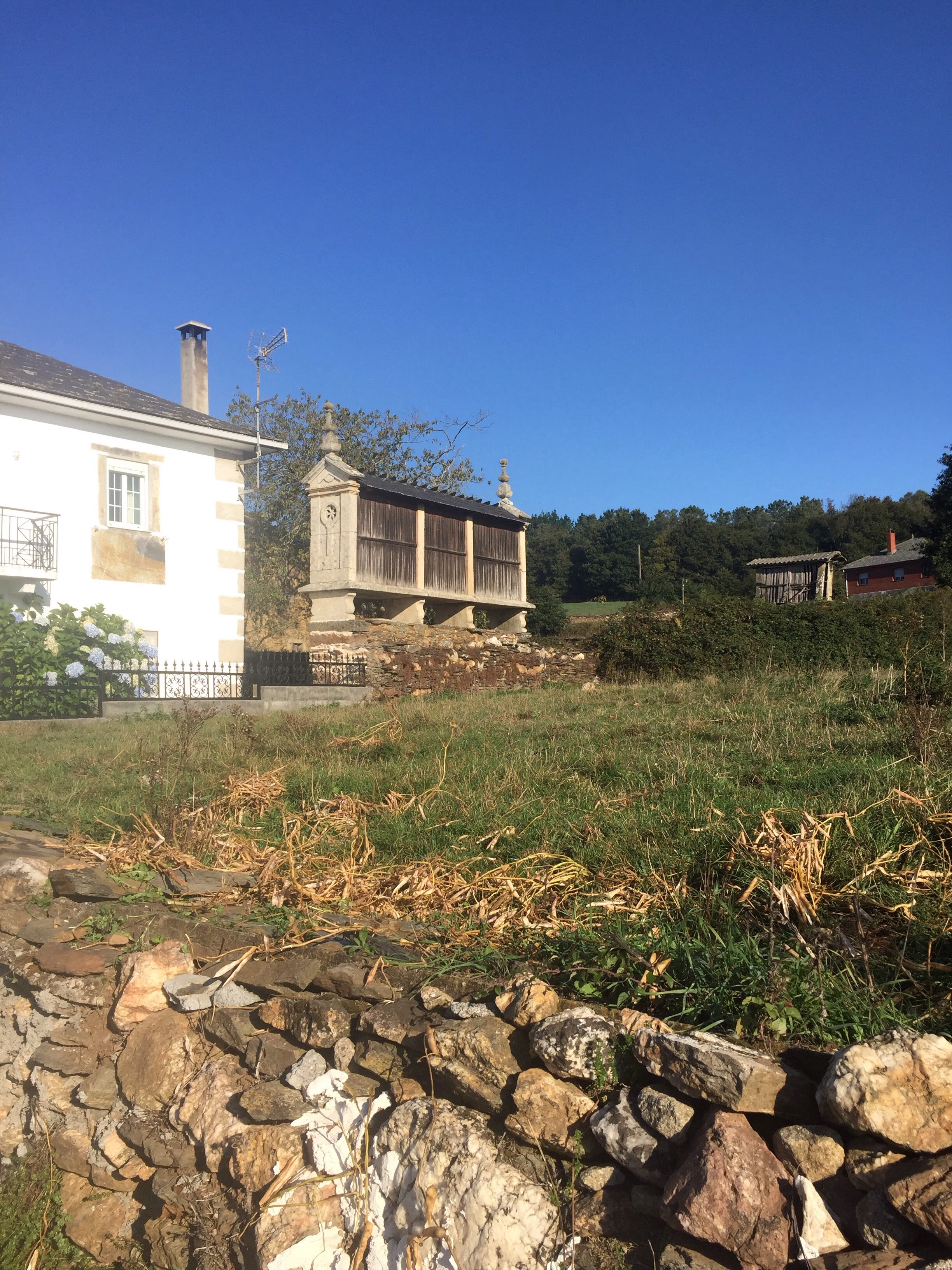 Early to rise after a poor nights sleep. Fog was thick this morning and we walked for almost 2.5 hrs up the mountain until we hit a cafe and the sun. We passed more corn dryers which are becoming more and more ornate day by day……